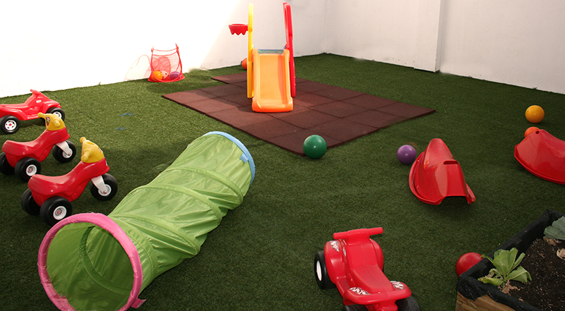 El patio es de propiedad del centro. Se accede a él por el aula de 2 a 3 años y tiene 48 metros cuadrados, suelo según normativa para parque y una zona acotada con tierra cultivable, jardín, que posibilita al niño/a un espacio de aprendizaje natural. En él tienen lugar actividades movidas, y para esto pueden encontrar: toboganes, gusano túnel, casita descubierta, triciclos, pelotas…. Se utiliza como recreo en el que los niños/as están en contacto directo con el aire y para desarrollar cualquier actividad que se programe.